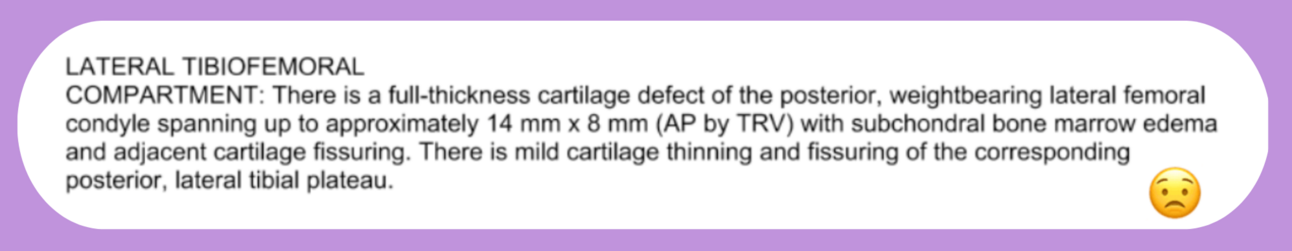My MRI results showing a full-thickness cartilage defect in my knee… 👎️